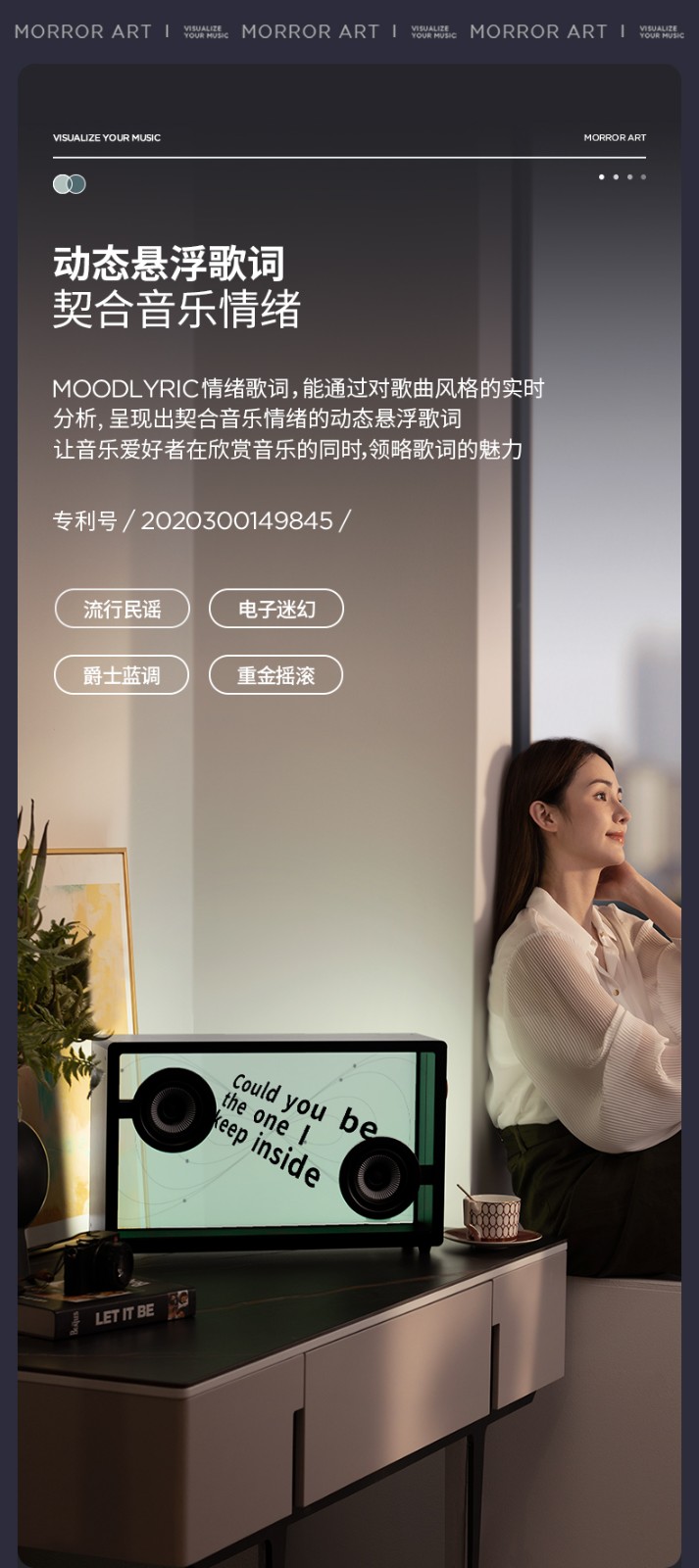 MoodLyric情绪歌词|极简主义美学|HiFi音质 编号:0100002977 统计:19177人已看过 麦极价:¥3799 品牌:MORRORART 品牌地:中国 产地:广东 规格:63.8x24x40.3cm 重量:12.80 kg.